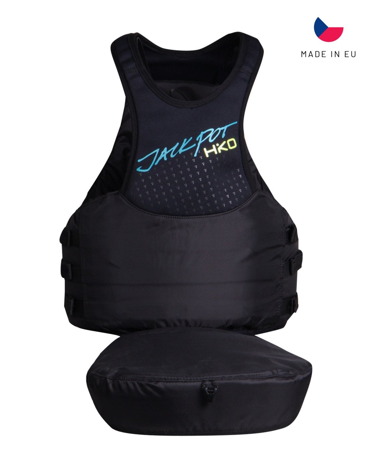 - A portion of buoyant volume from both the front and back panel is moved to external foam pillow which is connected to the main body via a flexible neoprene strap. This pillow is then inserted into a pocket in a sprayskirt and tucked away between the knees of the boater, keeping the same profile as the spraydeck even during the most extreme leanbacks. The front panel is extremely thin minimizing the space needed between the racer and the gate. The foam of the back panel is also reduced allowing for a much slimmer fit.